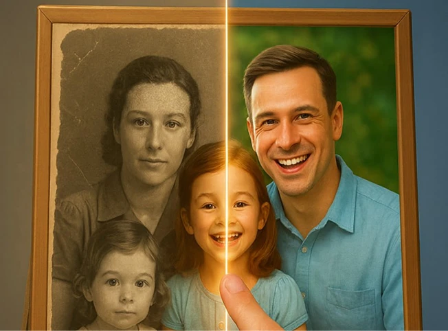 Посмотрите, как старые фотографии оживают на экране: лица начинают улыбаться, глаза блестят, моменты прошлого оживают в видео.